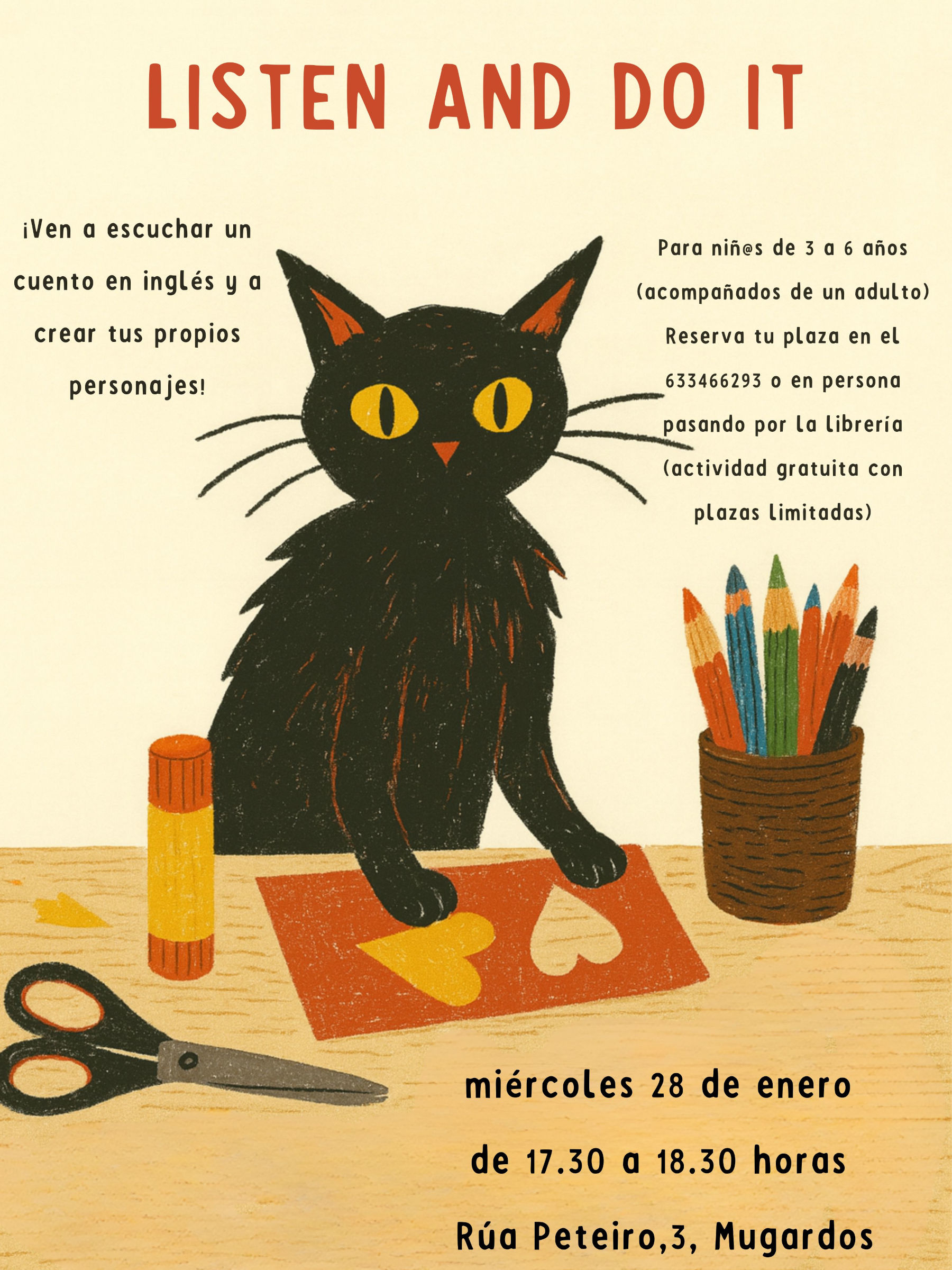 El día 28 de enero a las 17.30 horas en la Librería As Lendas do Gato tendremos una actividad destinada a los más pequeños: Listen and do it en la que escucharemos un cuento en Inglés.